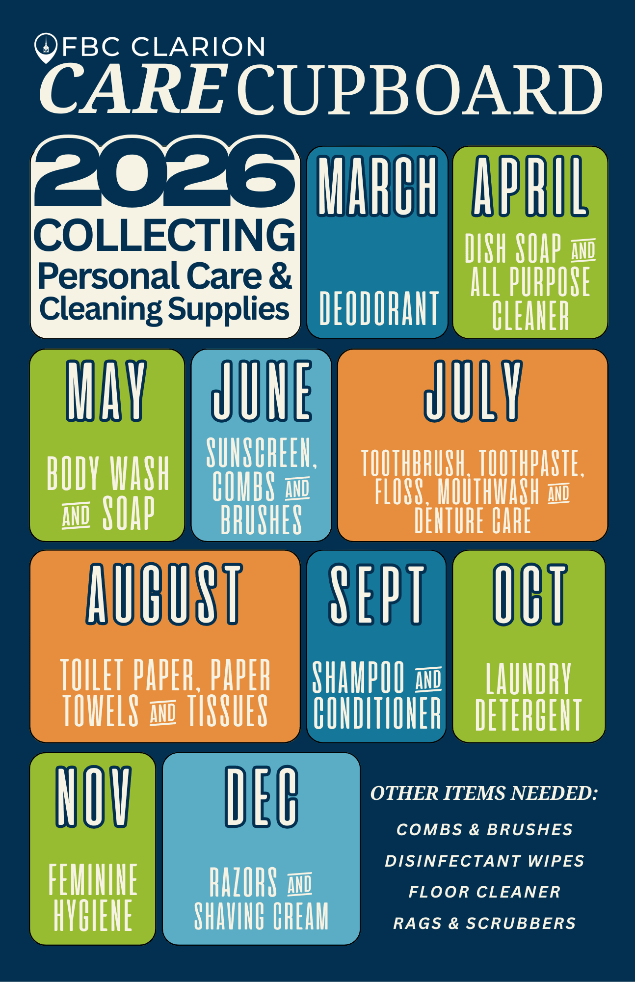 - Donations are collected monthly, with rotating item needs